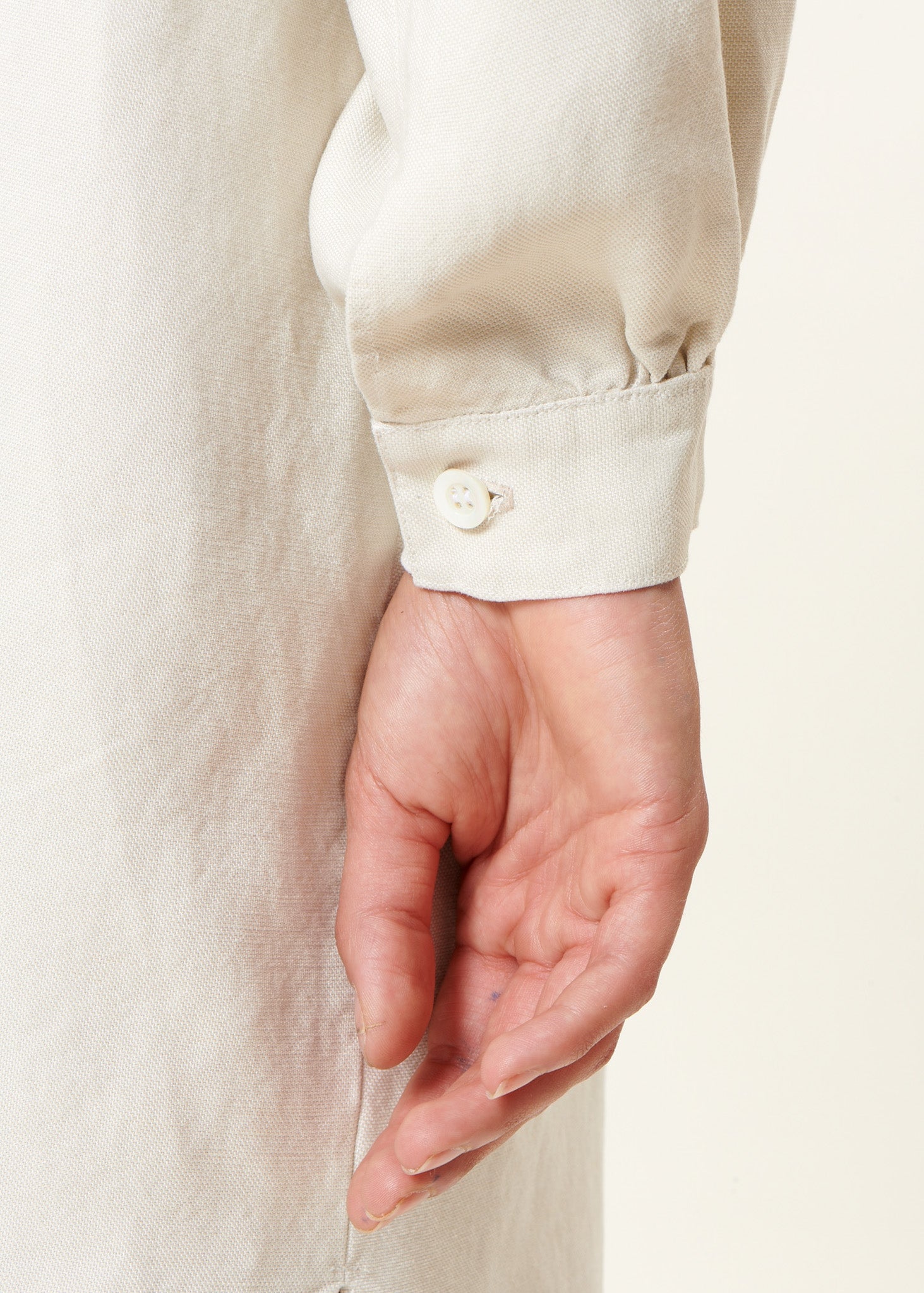 Midi dress in viscose and linen blend, ample volume, bib without collar and button placket, side slits, gathers at the back, mlong reeds.
